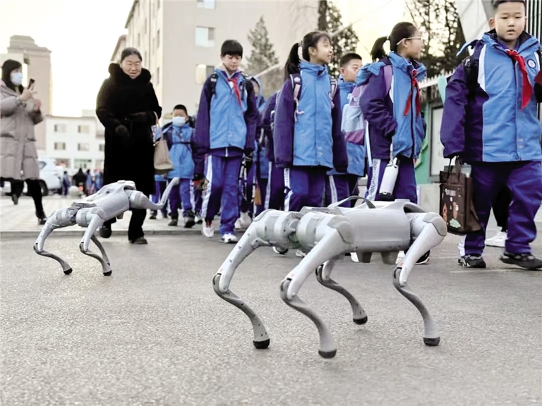 当日,一踏入校园,学生们就被新奇的科技元素吸引。面对提问,机器人流畅的对话让学生们惊叹不已。不远处,智能机器狗迈着矫健灵活的步伐在校园中穿梭,时而快速奔跑,时而做出高难度旋转动作,引得大家阵阵欢呼。“快看,机器狗!”惊叹声此起彼伏,激发了同学们对科技的浓厚兴趣。