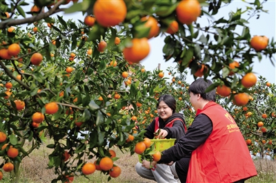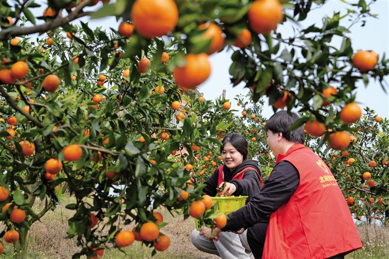 3月2日,在重庆市北碚区东阳街道西山坪农民工返乡创业园,来自西南大学的学生志愿者在帮助种植大户采摘沃柑。