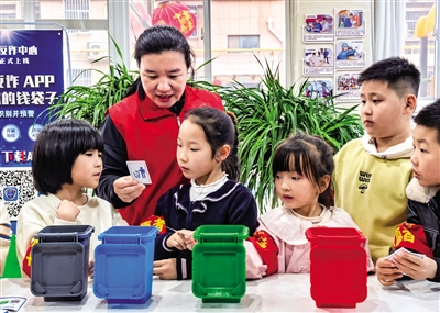 3月1日,志愿者在山东省乐陵市“学雷锋·文明实践我行动”幸福市集向孩子们宣传垃圾分类知识。