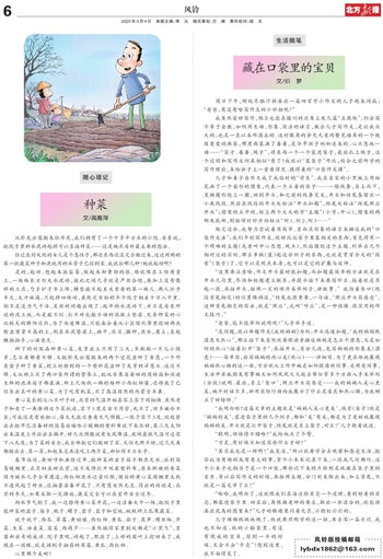 “其实我也是一样啊!”我笑道,“所以就要学会去观察和感受生活,把你认为有趣的或有意义的事,拿个小本本记录下来,一段或几句都行。这个小本子也相当于是一个口袋,那些记下来的片断则是收藏在袋子里的宝贝。等以后写作文的时候,再按照主题,分门别类取出来,加上首尾,不就是一篇文章了么?”
