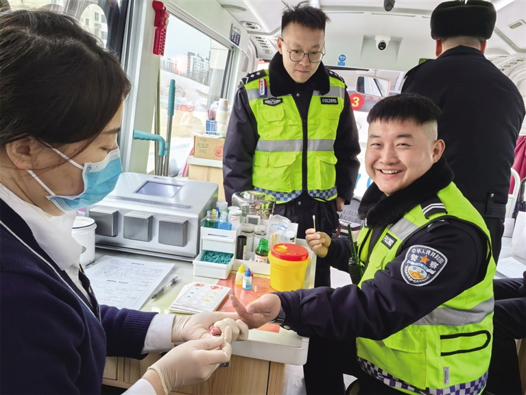 当天一大早,从“护学岗”和早高峰执勤下来的交警们陆续赶到内蒙古自治区血液中心。没来得及吃早点的他们有序排队等候体检。“没吃早点的,现场有补充体能的红糖水和饼干面包,大家吃完再献血。”在血液中心工作人员的提醒下,交警们边补充能量边互相打趣:“天上掉下个免费早餐!”