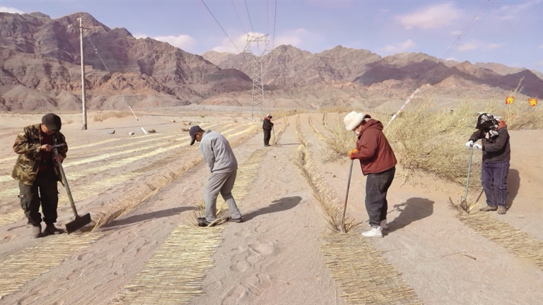 连日来,在巴彦淖尔市乌拉特后旗西补隆林业管护中心未治理沙地中,工人们一边铺芦苇,一边用铁锹压制沙障。该管护中心主任杜永军说:“我们先用长度为60厘米到80厘米的芦苇压制草方格,固定流沙,然后在其中种植灌木,最终实现治理沙地的目的。”