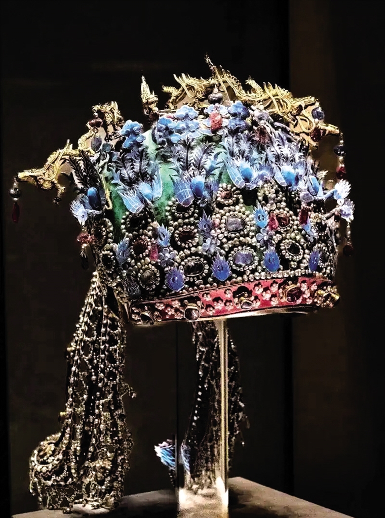 这顶九龙九凤冠是1957年10月20日在北京明定陵地宫出土的,属于孝端皇后。定陵共出土了四件凤冠,包括三龙二凤冠、九龙九凤冠、十二龙九凤冠和六龙三凤冠,其中孝端、孝靖两位皇后各拥有两顶。九龙九凤冠已被列为首批禁止出国(境)展览文物,同时也成了超高人气的镇馆之宝,其珍贵程度可见一斑。