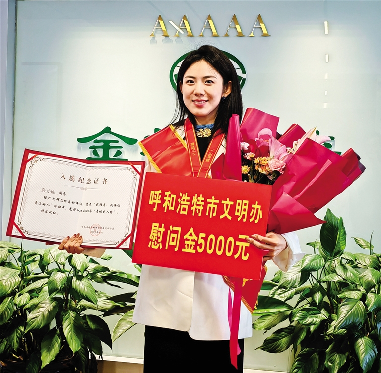 蒋丹妮是内蒙古金桥旅行社电商新媒体运营总监,也是一位热衷公益的姑娘,早在2022年,她便加入呼和浩特蓝哈达爱心公益团队,多次参与扶残助残、义务送考等公益活动。拿到“青城好人”的荣誉证书,蒋丹妮表示深感荣幸,今后在生活中发现需要帮助的人和事,依旧会挺身而出。