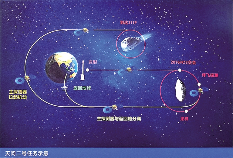 天问二号任务设计周期10年左右,主要任务目标是对小行星2016HO3进行探测、取样并返回地球,此后再对主带彗星311P开展科学探测。这是继探月、探火后,中国人在浩瀚星宇的又一次重要探索之旅。