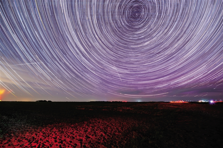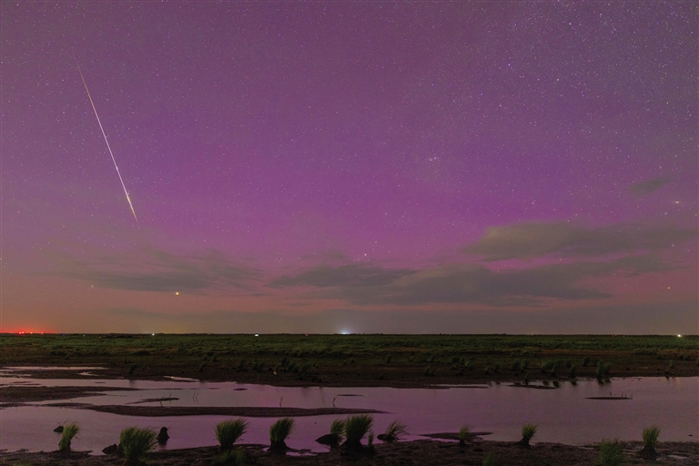6月2日在佳木斯市桦川县车轱辘泡湿地拍摄的极光与星空(堆栈合成照片)。