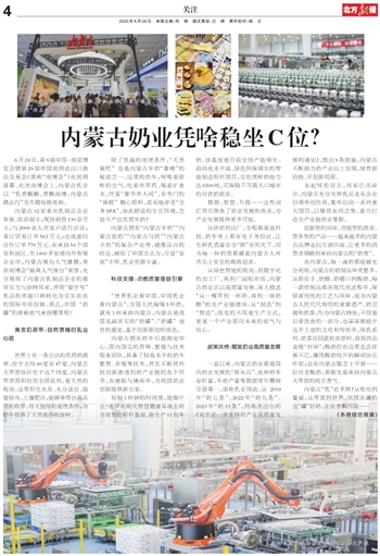 从绿色智能的牧场,到数字化的加工厂,再到广阔的市场,内蒙古奶业正以高质量发展,深入推进“从一棵草到一杯奶,再到一块奶酪”的全产业链建设。从“制造”到“智造”,改变的不仅是生产方式,更是一个产业面向未来的底气与信心。