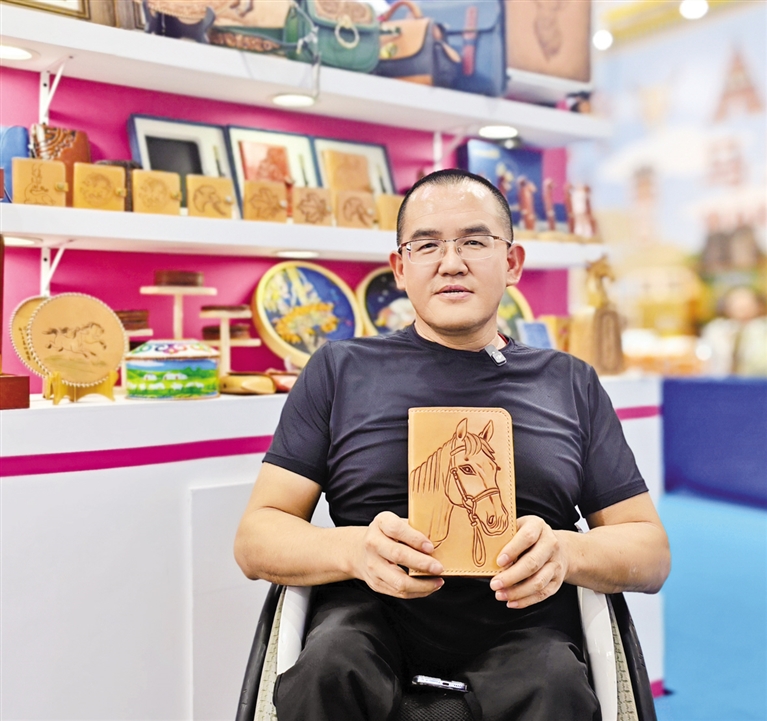 来自呼和浩特的周志亮也是一位坐着轮椅的残疾人,他的展位上陈列着皮包、皮画、皮带等各类精美的皮质工艺品,每一件都是他和残疾人朋友细心雕琢而成。这些作品还曾亮相法国巴黎奥运会,获得国际友人的认可。周志亮因儿时的一场疾病导致小儿麻痹后遗症,双腿无法行走。初中毕业后他靠摆地摊、跑三轮摩的维持生计。2018年,他经朋友介绍进入内蒙古蒙赞助残就业服务有限公司学习手工文创制作,历经7年磨砺,从学徒成长为师傅,每年要为50多名残疾人提供手工艺培训。他希望用自己的经历激励更多残疾人走出家门、掌握一技之长,从而走上就业岗位,增加收入和幸福指数。