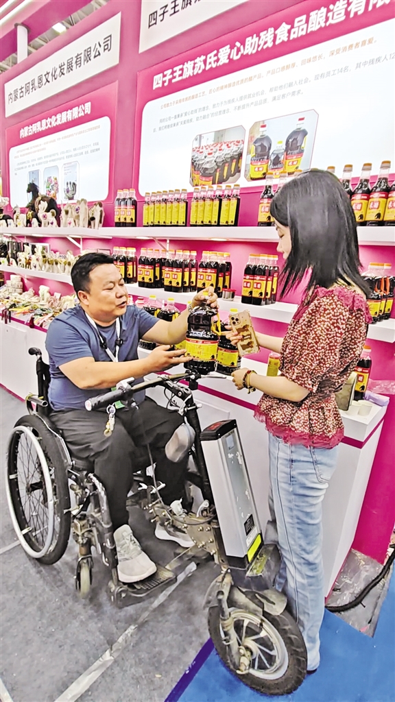 来自四子王旗的苏智平正将自产陈醋倒入纸杯,邀请顾客品尝,展区弥漫着醋香。苏智平拥有大学建筑专业文凭,曾是一家建筑公司的技术主管。然而,2010年的一次车祸改变了他的人生轨迹,不仅造成他双腿残疾无法行走,更令他意志消沉,长达6年闭门不出。