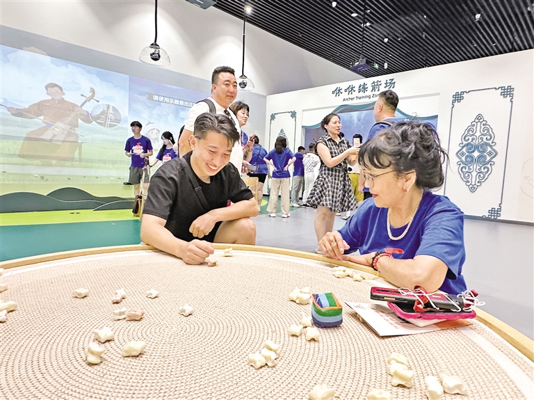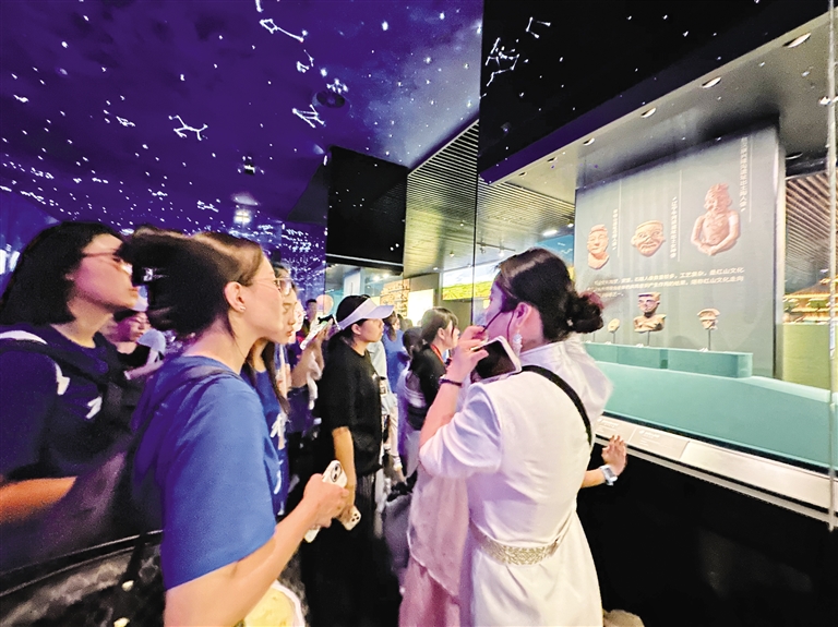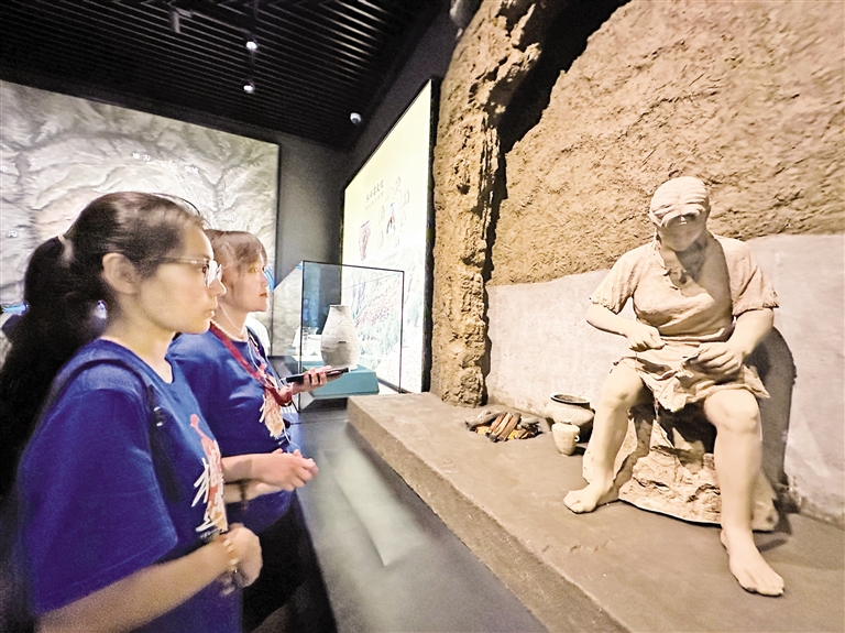 在VR沉浸空间,大家沉浸式体验内蒙古独特的自然景观与历史场景;在文物陈列区,陶器、青铜器、玉器等静静伫立,大家驻足凝视,探寻古人智慧。面对模拟古代生活场景的复原展区,青年们更是好奇满满,围绕先民生活雕塑,猜测当时的生产生活方式,在古今对话中触摸历史温度。