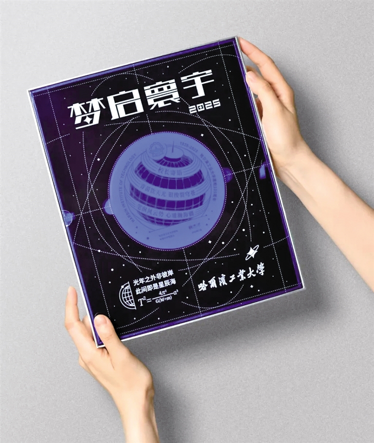 哈尔滨工业大学为2025级本科新生整体准备的“梦想”礼,以“梦启寰宇”为主题,围绕“宇宙、梦想、小卫星”进行设计。外盒正面用开普勒第三定律,呼应小卫星梦想遨游计划的星体运动定律。外盒背面则以星空、轨道、礼花,表达学校对学子们的未来期许。盒底的左下角还印制了一段摩斯密码,等待学子破解……