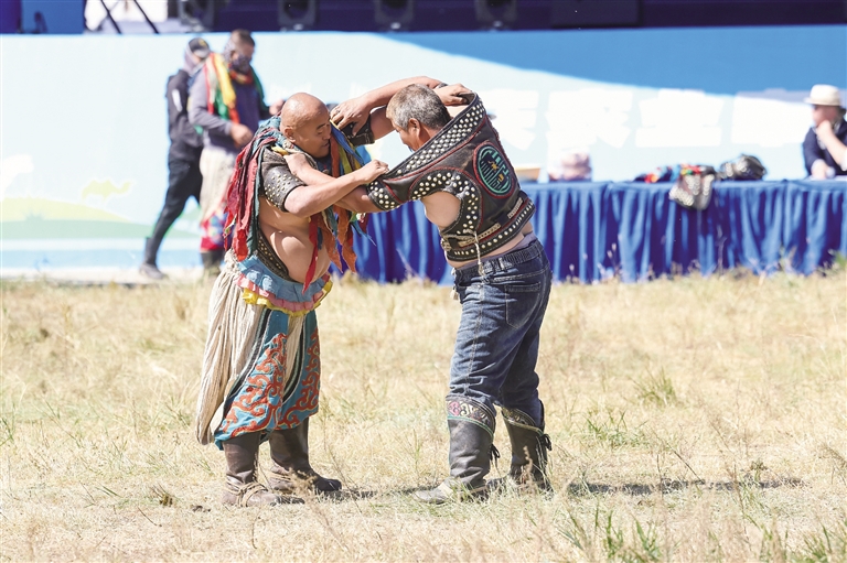 秋草连天,牧歌悠扬。开幕式在《牧民歌唱共产党》歌舞表演中开始。牧民们身着节日盛装,手提醇香的奶桶走来,笑容中充满丰收的喜悦;“北疆新农人”“头雁代表”“生态卫士”“农牧科技工作者”等先进代表随后入场,他们用智慧与汗水,共同谱写新时代农牧业发展的辉煌篇章;紧接着,搏克小队、射箭小队、牧民骑马小队入场,尽显坚毅与豪迈的英雄本色。