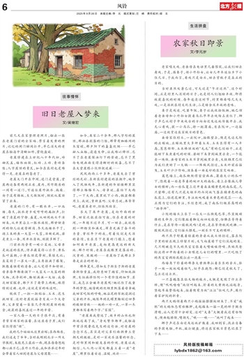 两只燕子舒展着轻盈的身姿从我头顶掠过,落在院子里的晾衣绳上停留片刻,又飞向屋檐下它们筑起的巢。几只刚破壳不久的燕宝宝张着大嘴嗷嗷待哺。燕妈燕爸轮流将口中衔着的小虫喂进儿女们的嘴里。一只吃饱了的燕宝宝调转屁股拉出一泡屎……