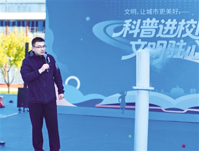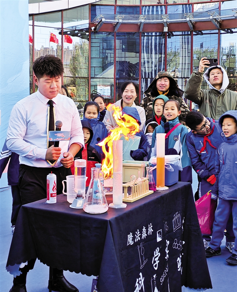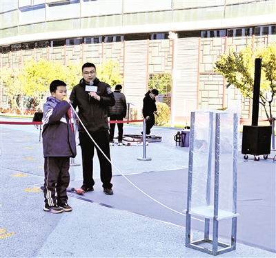 “哇……”一桶热水倒入液氮中,现场响起的巨大爆炸声让孩子们发出惊叹。活动现场,一系列奇幻科学秀将气氛推向高潮。“污水净化小实验”、液氮冻碎“不文明标语牌”、水火相融、掌中火、变色水、空气炮等酷炫的科学互动展示,引得孩子们睁大眼睛、啧啧称奇,他们纷纷上台参与实验,感受科学的魅力。