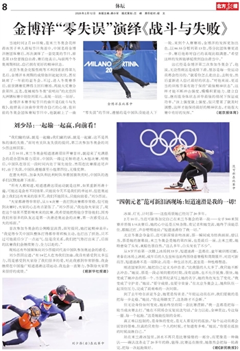 金博洋本赛季短节目的曲目是《战斗与失败》,他曾表示该曲非常符合自己的心境。在日前的冬奥会团体赛短节目中,他就献上了一曲“零失误”的节目,遗憾的是中国队没能进入下一轮。来到个人赛赛场,金博洋的发挥更加出色,以86.55分暂列第13位,得分比团体赛更进一步。赛后他称对自己的表现比较满意,“希望这样的发挥能够延续到自由滑当中。”