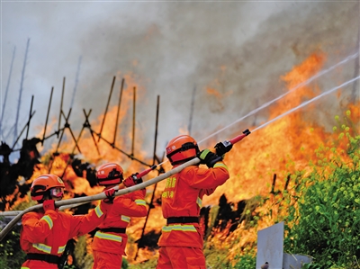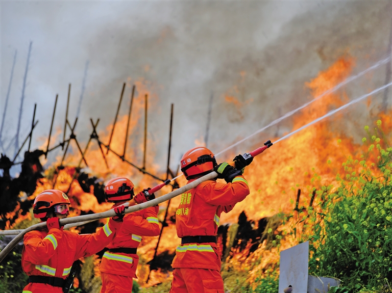 3月18日,新入职消防员进行灭火行动训练。3月17~18日,四川消防救援机动总队在位于成都的国家西南区域应急救援中心举行新消防员入职训练结业暨家属开放日活动,262名新消防员在亲人和战友见证下即将奔赴四川、重庆、西藏地区基层一线,应对各类自然灾害。据悉,这262名新消防员在成都完成为期6个月的42项专业训练,涵盖灭火、地震救援、水域救援等内容。 摄影/新华社记者 江宏景