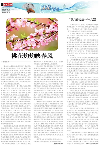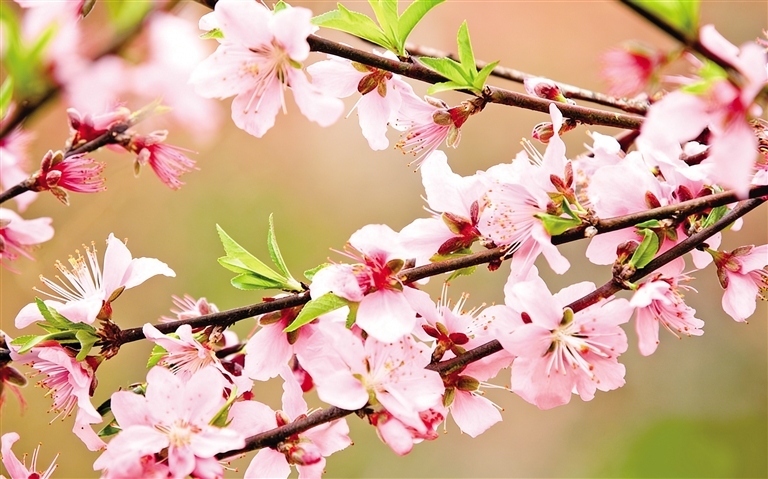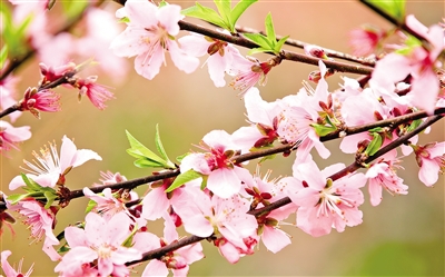 临水照花,更添桃花神韵。“竹外桃花三两枝,春江水暖鸭先知。”桃花亦是春天的信使,在春水边,悄然绽放,带来春的讯息。慢慢地,世界成了“芳草鲜美,落英缤纷”的桃源,“雨中草色绿堪染,水上桃花红欲然”。若在江畔独步寻花,桃花一定灼灼耀眼,杜甫诗云:“黄师塔前江水东,春光懒困倚微风。桃花一簇开无主,可爱深红爱浅红?”若在山中静谧独处,依然有桃花做伴,李白诗云:“问余何意栖碧山,笑而不答心自闲。桃花流水窅然去,别有天地非人间。”若仔细倾听,民歌里的桃花,也别有深意。刘禹锡《竹枝词》云:“山桃红花满上头,蜀江春水拍山流。花红易衰似郎意,水流无限似侬愁。”一溪流水,满树桃花,开时娇花照水,明艳动人;谢时花自飘零水自流,惹人情思。花开花落,都成诗行。