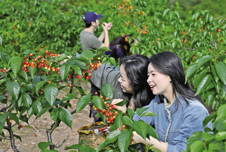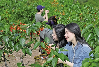 4月9日,游客在重庆市璧山区八塘镇云雾山樱桃谷采摘樱桃。当日,2026年重庆璧山“云雾花涧”第十一届樱桃采摘节暨文化旅游惠民消费季活动在八塘镇云雾山樱桃谷开幕。当地8000余亩樱桃正陆续成熟,采摘季将持续至4月底。近年来,重庆市璧山区大力发展樱桃产业,并积极推动农旅融合,助力乡村振兴。摄影/新华社记者 陈 诚