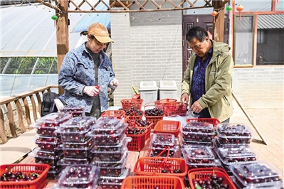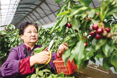 4月15日,市民在呼和浩特市新城区保合少镇野马图村种植大棚采摘樱桃。野马图村依托大青山前坡优越的生态条件与便捷交通,打造了集种植、采摘、培训于一体的现代农业园区。大樱桃、蟠桃、葡萄等陆续上市,实现全年果蔬不间断供应。园区果蔬品质优良,吸引不少市民前来体验采摘乐趣。(据草原云)