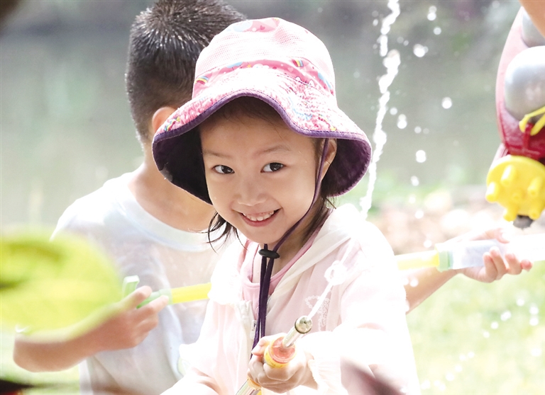 4月15日,小朋友在云南省景洪市参加泼水节活动。当日,云南省西双版纳傣族自治州迎来一年一度的泼水狂欢活动。各族群众与八方游客齐聚景洪市泼水广场,在水花飞溅中共庆泼水节。 (据新华社报道)