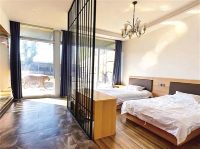 记者检索发现,网络购票页面显示,25~35平方米的双床标间,售价168元。工作人员表示,虎景房价格包含两张门票,不需要再单独买门票。宣传图片内,与一般酒店看起来无异的房间外,隔着透明的玻璃窗,老虎慵懒地来回走动。