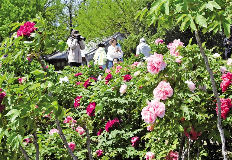 4月20日,游客在圆明园拍摄盛开的牡丹。谷雨时节,北京圆明园3万平方米的上百种牡丹迎来最佳观赏期,含经堂、藻园、镂月开云、鸿慈永祜等主要牡丹种植区域内,花王、姚黄、皇冠等珍贵品种次第盛开,为这座园林增添了浓郁的春日盛景。
