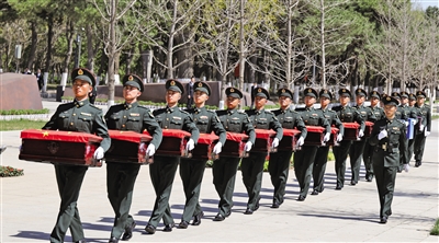 当日上午,中韩双方在韩国仁川国际机场举行志愿军烈士遗骸交接仪式。9时50分,呼号为“荣归50”的运-20B起飞。进入中国领空后,呼号为“红鹰”的4架歼-20迎接护航,“双20”列阵长空致以崇高敬意。11时25分,运-20B平稳降落在辽宁沈阳桃仙国际机场,机场以“过水门”最高礼遇为英灵洗尘。11时53分,第十三批在韩中国人民志愿军烈士遗骸迎回仪式开始。迎回仪式结束后,志愿军烈士遗骸棺椁被护送前往沈阳抗美援朝烈士陵园。春意盎然的沈阳街头,各界群众沿长街等候,向志愿军英灵致敬。第十三批在韩中国人民志愿军烈士遗骸安葬仪式于23日举行。摄影/新华社记者 杨 青