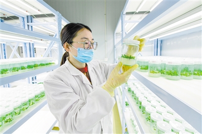 2月10日,呼和浩特市土默特左旗国家现代农业示范区的技术人员正在查看草莓脱毒原原种苗生长情况。近年来,当地充分发挥现代农业科技示范作用,通过研发育苗技术为企业、合作社、种植户提供服务,提高本土果蔬产品的产量和品质。本报记者 王晓博 摄