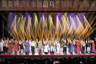 4月26日晚,全体演员演唱歌曲《奔腾的海骝马》。当日,歌舞晚会《永远的乌兰牧骑》专场演出在中央党校(国家行政学院)精彩上演。本次演出由中央党校(国家行政学院)图书和文化馆、自治区党委宣传部、自治区文旅厅主办,内蒙古艺术剧院、自治区直属乌兰牧骑联袂演绎。整场演出旋律悠扬、舞姿灵动,深情礼赞团结奋进的时代精神,为学员们献上一场精彩的文化盛宴。 本报记者 王磊 摄
