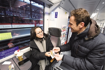 2月14日,在瑞士卢塞恩开往因特拉肯地区的金色山口列车上,瑞士中部铁路公司工作人员(右)为中国游客发巧克力。2月6日起,中国试点恢复赴瑞士等20个国家出境团队旅游和“机票+酒店”业务。 新华社记者 连漪 摄
