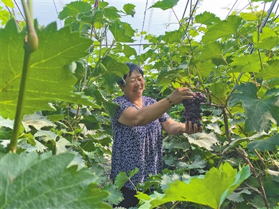 “我的膝盖做过手术,干不了重活儿。门前正好有5亩空地,村党支部书记建议我们发展庭院经济,还请了专业的技术员给我们指导。一年能有小1万块钱的收入,可帮了我们老两口大忙了。”走进兴安盟突泉县九龙乡吴家店村的刘家大棚,一颗颗晶莹剔透的紫葡萄挂满藤蔓,散发出沁人的清香。65岁的韩书兰正拿着剪刀穿梭在葡萄架下,一边采摘成熟的葡萄,一边畅聊丰收的喜悦。