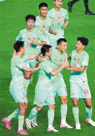 9月21日,中国队球员在比赛中庆祝进球。当日,在杭州亚运会男子足球小组赛A组比赛中,中国队以4比0战胜缅甸队。 新华社记者 李一博 摄