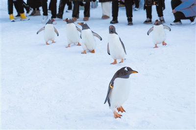 12月3日,哈尔滨极地公园的企鹅在户外进行冰雪巡游。时值周末,哈尔滨极地公园的企鹅亮相户外,上演冰雪巡游,吸引许多游客前来观赏。目前正是黑龙江省哈尔滨市的冰雪旅游季。新华社记者 戴锦镕 摄