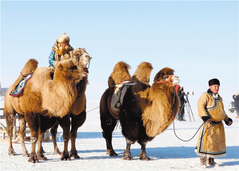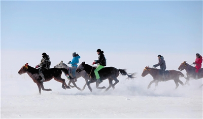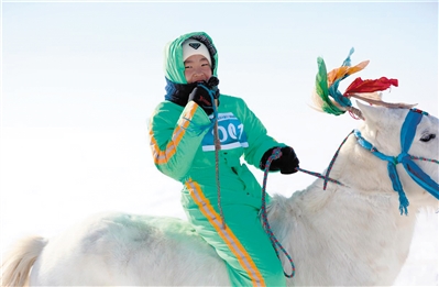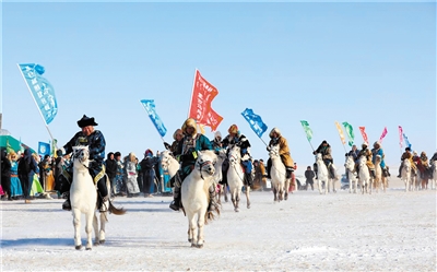 凛冽的寒风挡不住人们的喜悦和热情。联赛启动仪式上,勒勒车、骆驼骑手、驼撬缓缓驶入,身着冬季民族服饰的模特神采奕奕,“白马王子”和“白马公主”的表演靓丽灵动,骑手们身着盛装、跨马齐奔的形象生动地诠释了新时代草原人民一往无前的蒙古马精神。赛场上,呼啸驰骋的赛马与200多名威武潇洒的骑手在速度与耐力的比拼中角逐,让现场观众为之沸腾,慕名而来的游客尽情体验着锡林郭勒蒙古马超级联赛独特的魅力。