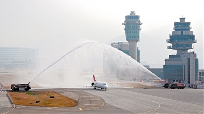 12月12日下午,香港国际机场以水门礼迎接ARJ21飞机。当日,国家自主研制的C919及ARJ21飞机抵达香港国际机场,展开首次访港之旅,其中C919飞机为首次出访中国内地以外的城市。