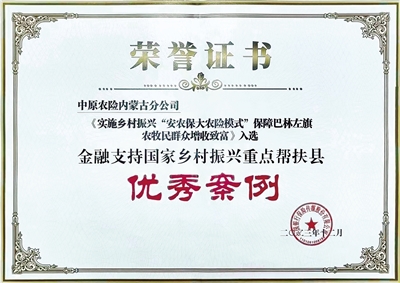 凭借支持重点帮扶县产业发展及保障农民增收的突出成果,中原农险内蒙古分公司《实施乡村振兴“安农保大农险模式”保障巴林左旗农牧民增收致富》助农案例在199个金融支持国家乡村振兴重点帮扶县案例中脱颖而出,成为全国16个保险业优秀案例之一。未来,中原农险内蒙古分公司将继续践行金融服务实体经济发展的根本宗旨,充分发挥“三农”领域的专业优势,积极整合综合金融力量,全力以赴,为推进内蒙古乡村振兴注入“源头活水”。(丁宁)