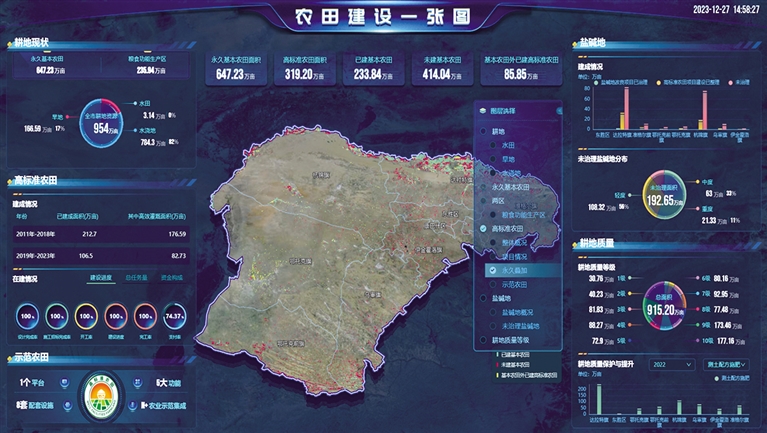 “农田建设一张图”,汇聚了“内蒙古农田建设项目管理系统”“全国农田建设综合监测监管平台”部省两级行业数据,以及市级三调数据、两区三线、高标准农田、盐碱地等地理信息数据,通过综合运用卫星遥感处理技术及数据治理,形成鄂尔多斯市农田家底一张图,开展农田可视化管理。可实时地、直观地、全面地掌握全市耕地现状、两区现状、高标准农田建设及盐碱地改良情况,从时间、空间、面积、占比、趋势等多个属性多维度进行数据分析,数据精准到村级,实现农田数据“市、旗、镇、村”四级监管调度。同时,将农业物联网技术与农田信息化管理有机结合,进一步提升农业智能化水平及数据化管理水平。