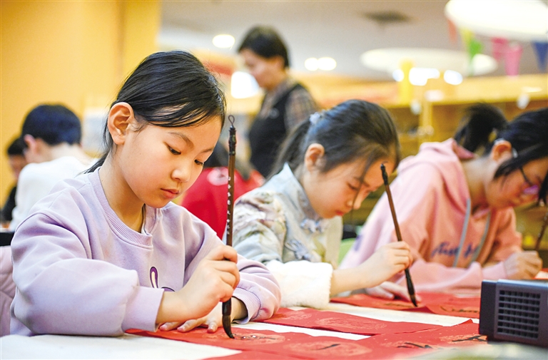 2月4日,参加活动的少年儿童写春联。当日,内蒙古自治区图书馆少儿部举办“笔墨迎春送祝福”活动。书法老师向参加活动的少年儿童介绍了文字的起源、书法的历史等相关知识,小书法爱好者们在老师的指导下学民俗、写春联。孩子们在浓浓的年味中深切感受传统文化的魅力。本报记者 王磊 摄