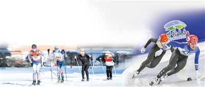 内蒙古冰雪运动学校的学生正在练习越野滑雪。 孟和朝鲁 摄 “十四冬”短道速滑青年组比赛现场。 孟和朝鲁 摄