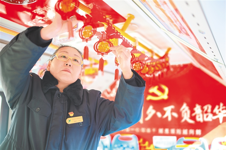 2月10日,驾驶员在车厢里布置新春元素。春节期间,为保障市民出行,呼和浩特市公共交通有限责任公司所设的100余条公交线路,除23条城乡线路正月初一停运1天外,其余线路全部正常运营,方便市民、游客出行游玩。