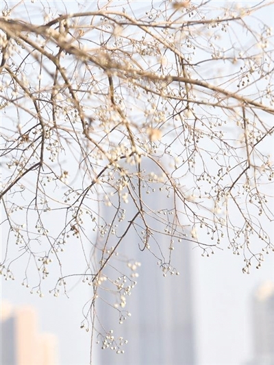 乌桕籽有它独特的美,凝霜经雪,灼灼其华,宛若绽放。点缀树枝,也启发着人们的想象,想春天到来时的花。