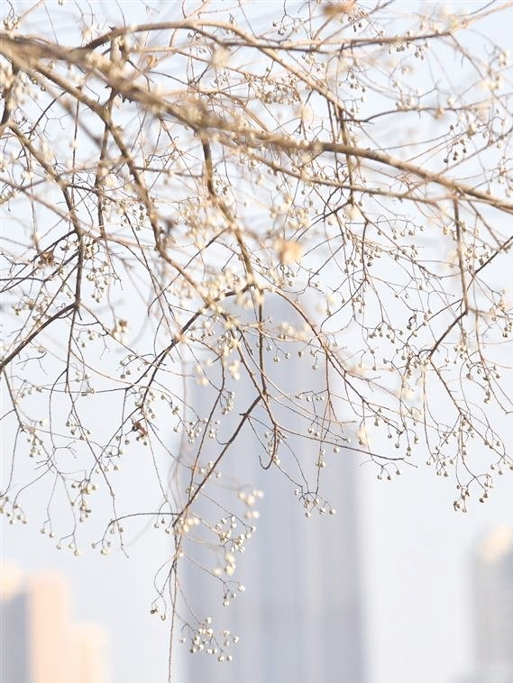 遥看乌桕籽像盛开的“花”,在冬日里温情盛放。当姹紫嫣红全落尽,多若繁星的乌桕籽在细瘦的树枝上,一团团,一簇簇,宛若娟秀的素色小花。