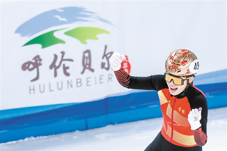 2月17日,张楚桐在冲过终点线后庆祝。当日,在内蒙古呼伦贝尔市海拉尔区内蒙古冰上运动训练中心短道速滑馆举行的第十四届全国冬季运动会短道速滑(公开组)女子500米决赛中,吉林队选手张楚桐以43秒011的成绩夺得冠军,吉林队选手王艺潮和辽宁队选手吕晓彤分别获得亚军、季军。 新华社记者 李博 摄