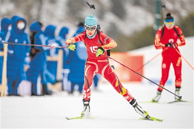 2月18日,吉林队选手孟繁棋以52分55秒8的成绩夺得冬季两项公开组女子15公里个人赛冠军。 新华社记者 伍志尊 摄