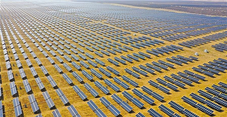2023年,国家首个千万千瓦级大型风光基地——库布其沙漠鄂尔多斯中北部新能源基地一期先导工程光伏项目全容量并网发电,年供清洁电能20亿度,年节约标煤60万吨、减排二氧化碳166万吨。