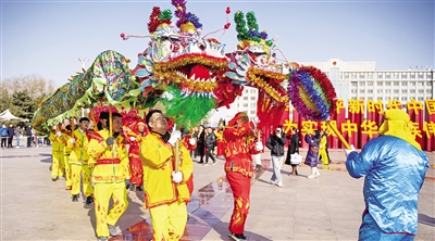 2月23日,人们在广场表演舞龙。当日,“龙耀新春 幸福赛罕”元宵节民间社火、秧歌等民俗展演在呼和浩特市赛罕区政府文化广场举行。现场锣鼓喧天、人声鼎沸,来自赛罕区金河镇、昭乌达街道的400余人组成的社火展演队为市民带来了秧歌、舞龙、舞狮等表演。 本报记者  王磊  摄