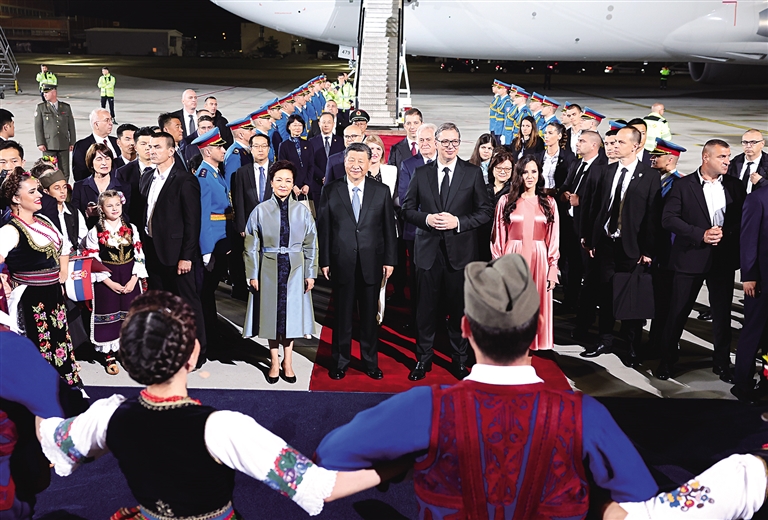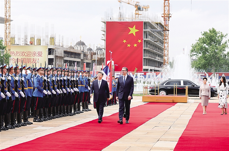 5月的贝尔格莱德,阳光明媚。塞尔维亚大厦前,中塞两国国旗迎风飘扬,仪仗队威武雄壮。习近平和夫人彭丽媛乘车抵达时,塞尔维亚总统武契奇和夫人塔玛拉在下车处热情迎接。