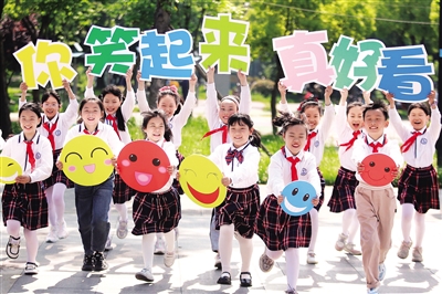 5月8日,江苏省扬州市何园社区的小朋友在“笑迎世界微笑日”活动中手举笑脸卡做游戏。当日是“世界微笑日”。微笑是无声的问候,微笑是人类最美丽的语言。让我们通过微笑,传递爱,汇聚起感染人心的力量。新华社发