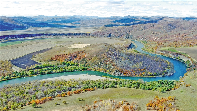 流经呼伦贝尔草原的莫尔格勒河,有着“天下第一曲水”之称,它发源于大兴安岭西麓,由东北流向西南,汇入海拉尔河,属额尔古纳河水系。莫尔格勒河的河道十分狭窄,弯弯曲曲。从空中俯瞰,河水蜿蜒,就像一条蔚蓝色的绸带。在都叶梅的剪纸作品《多彩呼伦贝尔·极致草原》中,莫尔格勒河显得不那么抽象、夸张,而变得具体、亲切,甚至有了灵性,它被都叶梅赋予了更多精神层面的东西,穿过碧草连天的大草原,奔向美好未来。