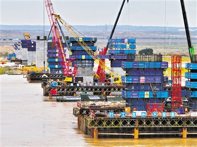 10月23日,随着最后一方混凝土泵送入模,中交二公局国道110线磴口黄河大桥项目主桥承台顺利完成浇筑。国道110线磴口黄河大桥项目横跨巴彦淖尔市磴口县与鄂尔多斯市杭锦旗黄河两岸,采用双向四车道一级公路标准建设,大桥长度3.098km,路基全长8.644km。项目建成后, 对助力两地旅游资源开发、乡村振兴等具有重要意义。本报记者 薛来 摄